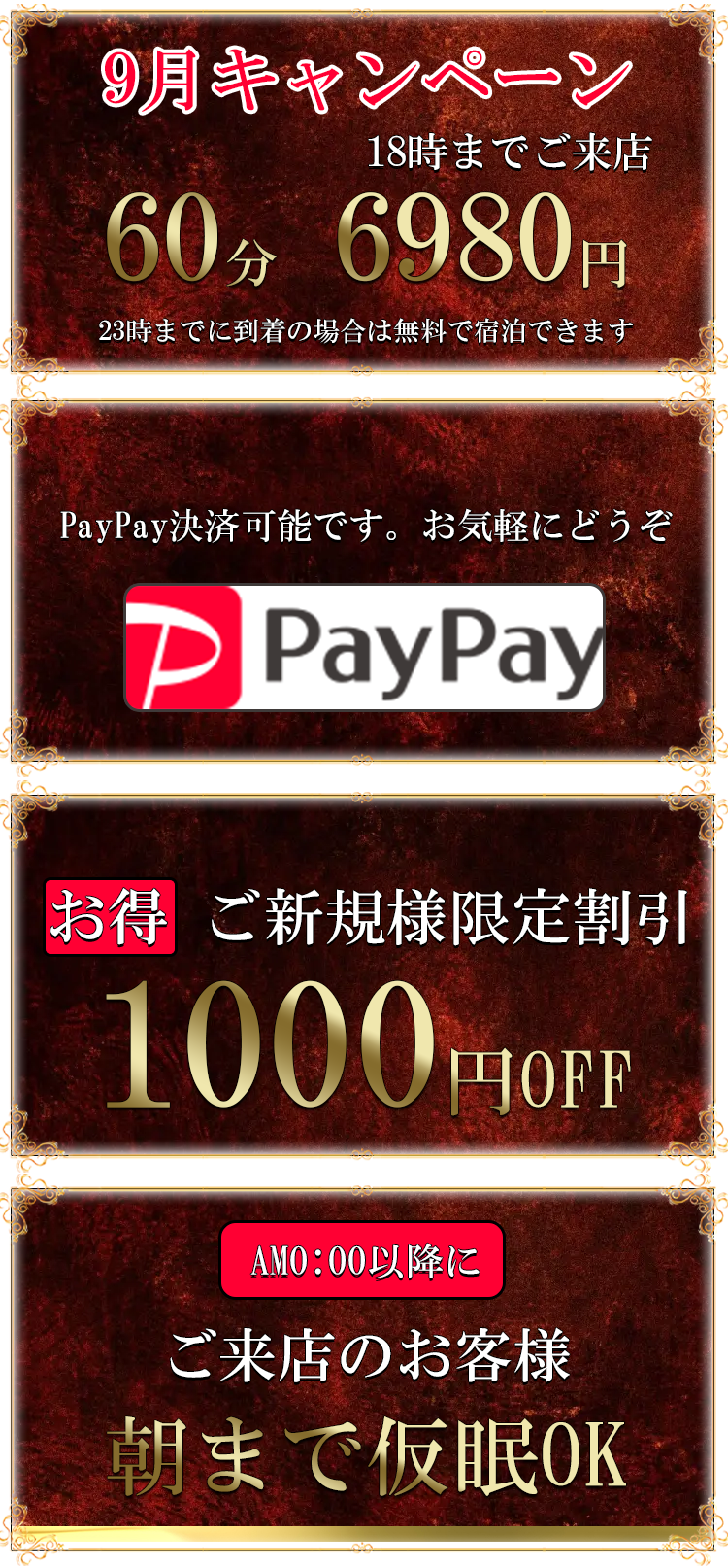 当店では、アロマオイルの効能と当店自慢のセラピストによるリンパマッサージの相乗効果による、癒しのひとときをお客様お一人お一人にお届けしております、自然で心やすらぐ優美な香りを、施術中はもちろんご帰宅お休みになってから翌日朝目覚めでまで楽しんで頂けます、どうぞゆっくりご堪能ください。